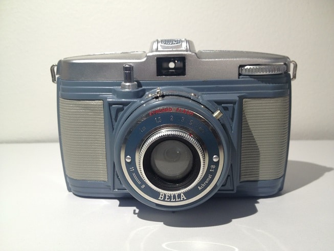 Bilora Bella tillverkades i en mängd olika varianter under åren 1953 – 1966. Just denna modell är från mitten av 50-talet, förmodligen 1956. Den tillverkades även för olika filmformat såsom 120, 127 och 135mm film. Bellan var en ganska billig kamera som dock tilltalar estetiskt, den tillverkades i en mängd olika färgkombinationer.